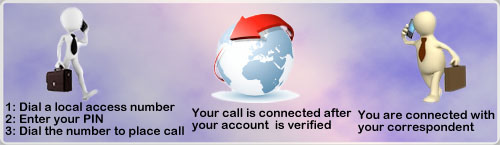 Call a local number we send you, enter your PIN and dial a phone number any where in the world. | |||