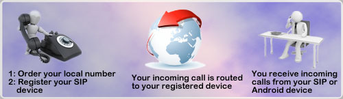 Order a local phone number from us; register your SIP device or Smart phone apps with your account. We will route incoming calls to your desk or Android phone no matter where you are. | |||